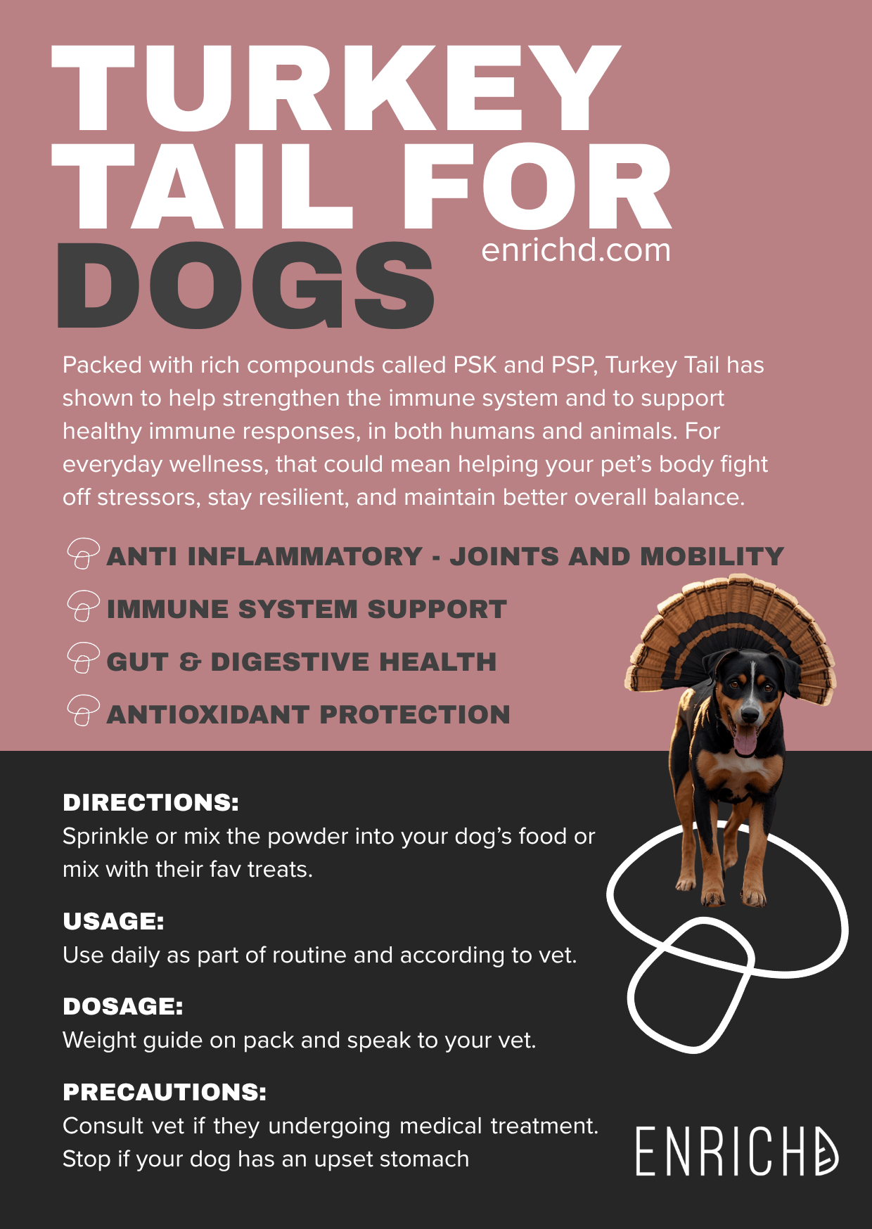 Turkey Tail Mushroom complementary feed for dogs. To help support healthy happy dogs and more wagging tails.